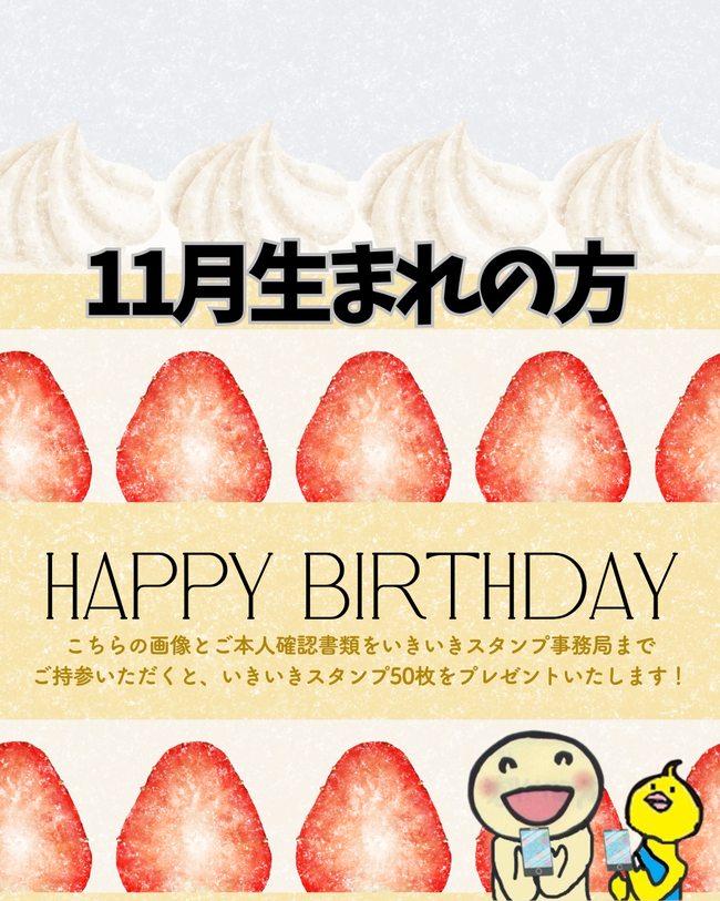 今月、お誕生月の方は、期間中にこちらの画面と、ご本人様の誕生月が証明できるものを、いきいきスタンプ事務局にお持ちいただき、ご提示ください。いきいきスタンプ50枚プレゼントいたします。